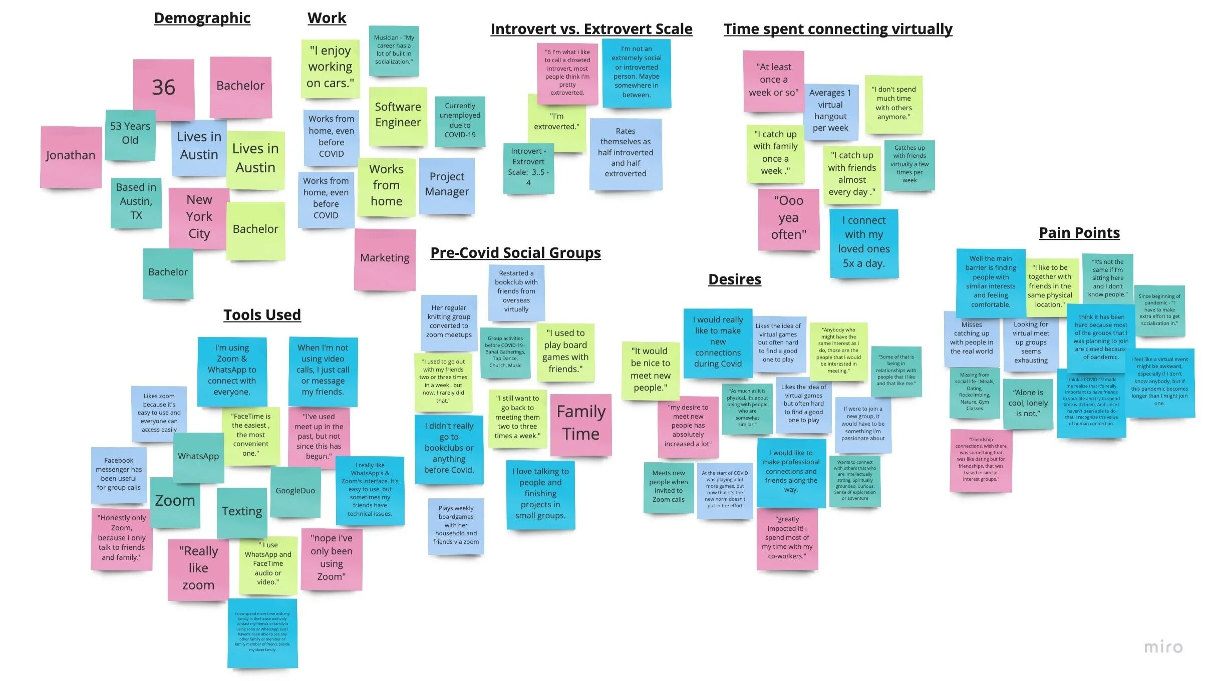 We began our research by interviewing and surveying technology literate users from the ages of 18-55 to see how the Covid-19 pandemic impact their new and current connections.